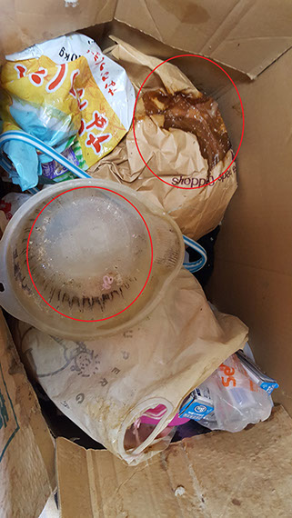 仕分けをする為、中身を確認するとウジ虫が大量に発生しておりました。